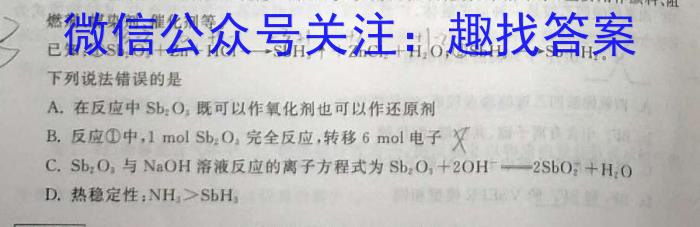 13.Sb与N位于同一主族,三氧化二锑((Sb2O3)为两性氧化物,难溶于水,主要用作颜料、阻B燃剂、媒染剂、催化剂等1Sb2O3+Zn^2+Zn+ClSH3^++ZnCl2+H2O;2SbH3Sb+H2。下列说法错误的是A.在反应中Sb2O3既可以作氧化剂也可以作还原剂B.反应①中,1molSb2O3完全反应,转移6mol电子C.Sb2O3与NaOHH溶液反应的离子方程式为Sb2O3+2OH^-2SbO2^-+H2OD.热稳定性:NH3>SbH3