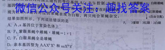 4.果蝇的眼色由两对独立遗传的等位基因A/a、B/b控制,A和BP红眼蝇A/a、B/b白眼雄蝇基因同时存在时果蝇表现为紫眼,A和b基因同时存在时果蝇表现为红眼,a基因对应的果蝇表现为白眼,两只纯合果蝇杂交,结果如图所示。下列说法错误的是F1紫眼雌蝇红眼雄蝇(自由交配)F233紫眼:3红眼1×22白眼A.A、a基因位于常染色体上B.F2紫眼果蝇中雌蝇:雄蝇=1:1C.F2白眼果蝇全是雄蝇D.亲本基因型为AAX^bX^b和aaX^BY