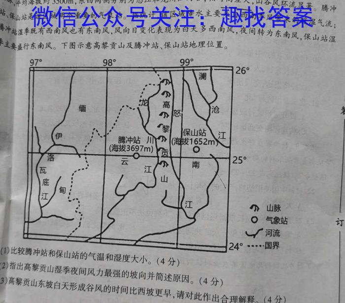 高贡山位于横断山脉最西部,是一座位于西南季风和东南季风交汇区的南北走向的狭长型长型山脉平均海拔约3500m,东西两侧分别为怒江和龙川江河谷,相对高差大,山谷风环流显著。腾冲站、保山站是该区域两个重要的气象站。据统计,该区域降水主要来自西南季风带来的暖湿气流;腾冲站湿季既有西南风也有东南风,风向日变化表现为白天多西南风,夜间转为东南风,保山站湿季主要盛行东南风。下图示意高黎贡山及腾冲站、保山站地理位置。9999^。》山脉。气象站河河流.国界(1)比较腾冲站和保山站的气温和湿度大小。(4分)(2)指出高黎贡山湿季夜间风力最强的坡向并简述原因。(4分)