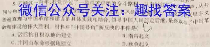 5.回顾这一百年,我党走过了一段艰苦卓绝的奋斗路程。从南湖红船到八一枪声,从井冈号角到长征壮歌,从抗日烽火到建国大业,从改革春风到小康蓝图……我党把普遍真理与中国革命和建设的具体实践相结合,领导中国人民前赴后继,最终取得了中国革命和建设的伟大胜利。材料中“井冈号角”所反映的事件是(0A.敌后抗日根据地的建立B.南昌起义C.井冈山革命根据地建立D.秋收起义