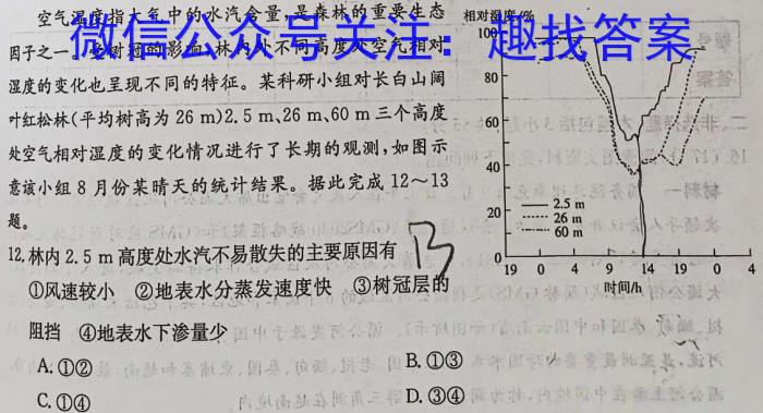 空气湿度指大气中的水汽含量,是森林的重要生态因子之一。受树冠的影响,林内外不同高度处空气相对湿度的变化也呈现不同的特征。某科研小组对长白山阔叶红松林(平均树高为26m)2.5m、26m、60m三个高度处空气相对湿度的变化情况进行了长期的观测,如图示意该小组8月份某晴天的统计结果。据此完成12~13题。相对湿度/%·12.林内2.5m高度处水汽不易散失的主要原因有13①风速较小②地表水分蒸发速度快③树冠层的时间/h阻挡④地表水下渗量少国A.①②B.①③C.①④D.③④