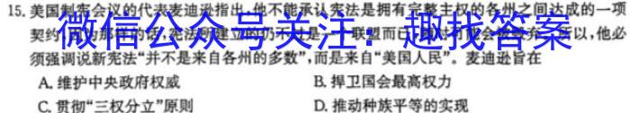 15.美国制宪会议的代表麦迪逊指出,他不能承认宪法是拥有完整主权的各州之间达成的一项契约,因为那样的话,宪法所建立的仍不过是一个联盟而已,随时可能会被毁弃。所以,他必须强调说新宪法“并不是来自各州的多数”,而是来自“美国人民”。麦迪逊旨在A.维护中央政府权威B.捍卫国会最高权力C.贯彻“三权分立”原则D.推动种族平等的实现