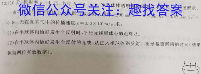 13.(10分)折射率n=1.25、半径R=0.10m的半球体透明介质放置在水平面上,如图所示一束平行光垂直半球体上方的圆形截面射入球体,已知53^=0.8、69^=0.93,58^=0.85,光在真空气中的传播速度c=3.010^8m/s,(1)在半球体内恰好发生全反射时,平行光线到球心的距离d。(2)在半球体内恰好发生全反射的光线,从进入半球体到反射回圆形截面所用的时间(结果保留两位有效数字)。