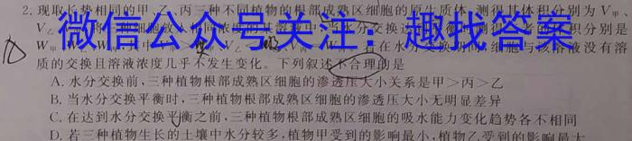 2.现取长势相同的甲、乙、丙三种不同植物的根部成熟区细胞的原生质体,测得其体积分别为V甲、V将三种细胞放入相同浓度的某溶液中,当水分交换达到平衡时测得三者的体积分别是10W甲、W乙、WN1,,其中V甲、V<乙B.当水分交换平衡时,三种植物根部成熟区细胞的渗透压大小无明显差异C.在达到水分交换平衡之前,三种植物根部成熟区细胞的吸水能力变化趋势各不相同D.若三种植物生长的土壤中水分较多,植物甲受到的影响最小,植物乙受到的影响最大