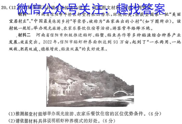 20.(12分)农村实现可持续发展的途径很多。阅读图文材料,完成下列要求。材料一河南省信阳市平桥区郝堂村依山傍水,环境优美,荣获全国第一批“美丽宜居村庄”、“中国最美休闲乡村”等荣誉,被称为“画家画出的小村”(如下图所示)。该村统一规划,举办观光旅游、农家乐餐饮住宿等活动,游客常年络绎不绝。材料二河南省信阳市积极推进稻虾、稻蟹、稻鱼共作等多种稻渔综合种养产业发展,效益突出。2022年,信阳市稻虾种养面积达到93万亩,起到了“一水两用、一地双收、肥药双减、稳粮增效、稻渔双赢”的良好效果。(1)推测郝堂村能够举办观光旅游、农家乐餐饮住宿的区位优势条件。(6分)(2)请依据材料具体说明稻虾种养模式的好处。(6分)