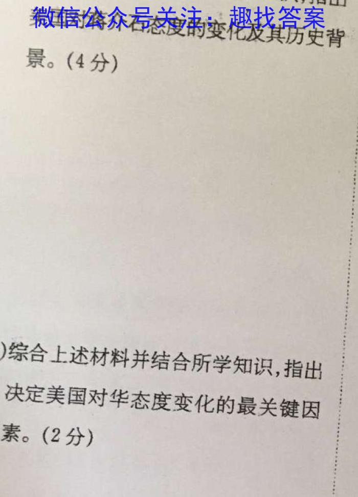 (2)根据材料一、二并结合所学知识,指出美国对态度的变化及其历史背景。(4分)(3)综合上述材料并结合所学知识,指出决定美国对华态度变化的最关键因素。(2分)材料二200013001400150016001700180019002000年英国中世纪以来的价格草命摘编自费舍尔《价格革命:一部全新的世界史》(1)根据材料一并结合所学知识,指出近代早期英国粮价上涨的原因。(6分)(2)根据材料二并结合所学知识,阐述英国的价格革命的特点和影响。(10分)