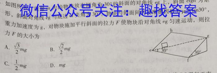 30^efgh如图所示,质量m为的物块放在倾角为30°的斜面的对角线e上,斜面efgh为矩30^。=30^,形,斜面对角线e与底边ef夹角为30°。物块与斜面间的动摩擦因数为μ=tan30°,重力加速度为g,对物块施加平行斜面的拉力F使物块沿对角线eg匀速运动,则拉力F的大小为