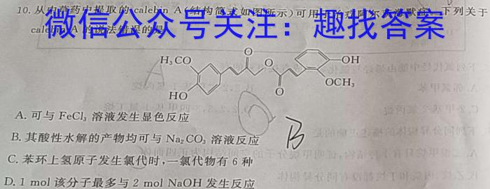 10.从中草药中提取的calebinA(结构简式如图所示可用于治疗呵尔茨海默症。列关于calebA的说法错误的是A.可与FeCl3溶液发生显色反应B.其酸性水解的产物均可与Na2CO3溶液反应C.苯环上氢原子发生氯代时,一氯代物有6种D.1mol1该分子最多与2molNaOH发生反应