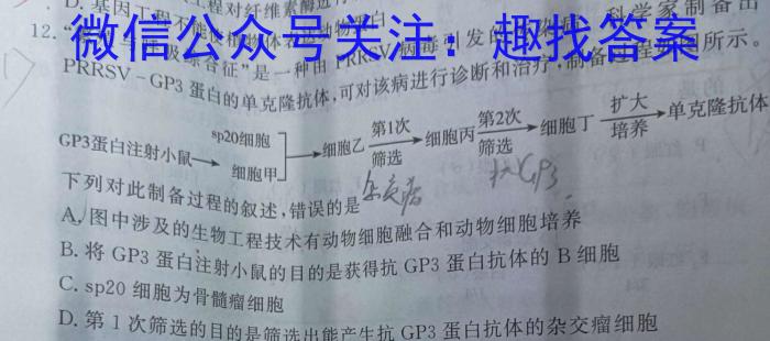 D.基因工程不能使植物体表达动物蛋白繁殖图度1712.“繁殖与呼吸综合征”是一种由PRRSV病毒引发的呈如PRRSV-GP3合由PRRSV疗,,制制备PRRSV~GP3蛋白的单克隆抗体,可对该病进行诊断和治疗,的单克降抗抗体,可扩大>单单克隆抗体第2次GP3蛋白注射小鼠一sp20sp20细胞第1次细胞丁培养细胞丙细胞乙筛选筛选细胞甲下列对此制备过程的叙述,错误的是杂交病状CP3养养A.图中涉及的生物工程技术有动物细胞融合和动物细胞培养BB.将GP3蛋白注射小鼠的目的是获得抗GP3蛋白抗体的B细胞C.sp20C.sp20细胞为骨髓瘤细胞D.第1次筛选的目的是筛选出能产生抗GP3蛋白抗体的杂交瘤细胞