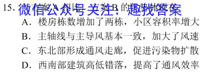 15.与方案A相比,方案B的优势体现在A.楼房栋数增加了两栋,小区容积率增大B.主轴线与主导风基本一致,加大了风速C.东北部形成通风走廊,促进污染物扩散D.西南部建筑高低错落,提高了通风效率