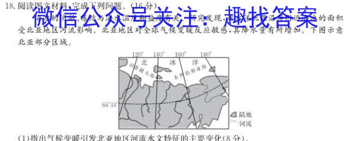 18.阅读图文材料,完成下列问题。(16分)海冰的消融、冻结与海水温度和盐度有关。研究发现,北冰洋北亚沿岸附近海冰的面积受北亚地区河流影响。北亚地区对全球气候变暖反应敏感,其降水量有所增加。下图示意北亚部分区域。(1)指出气候变暖引发北亚地区河流水文特征的主要变化(8分)。(2)分析春季北亚地区河流水量变化对北冰洋沿岸海冰消融的影响(4分)。