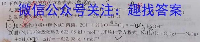 12.下列化学反应的有关方程式表示错误的是ADA.碱性条件下,NaClO溶液与SO2反应:2OH^-+ClO^-+SO2SO4^2-+Cl^-+H2OB.氢硫酸久久置在空气中:2H2S+O22S+2H2OC.用石墨作电极电解NaCl溶液:2Cl^-+2H2O通电Cl2+A2+OH^-D.肼(N2H4)的燃烧热为622.08kJmol^-1,其热化学方程式:N2H4^7(1)+O2(g)N2(g+2H2O3H=-622.08kJmol^-1