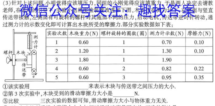 (3)针对上述问题.小明觉得应该填压力,同组的小刚觉得应该填重力,于是两人决定去请教老师,在老师的引导下,实验小组将实验装置改进如下图,木块挂在测力计下,右侧面与竖直传送带接触,左侧面有可旋转的螺杆对其施加不同的压力,启动电机,传送带逆时针转动,通过测力计的示数变化即可计算出木块所受的摩擦力.部分实验数据如下表:①该实验用来表示木块与传送带之间压力的大小.②第3次实验中,木块受到的滑动摩擦力大小是N.③比较三次实验的数据可知,滑动摩擦力大小与物体重力无关.
