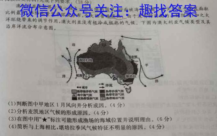 18.阅读图文材料,完成下列要求,(18分)澳大利亚是世界上唯一独占一个大陆的国家,四面被海所包围,澳大利亚于旱区面积比例最大,年降水量呈年环状分布,全大陆普地暖热由于没有特别高的山脉阻隔,加之大洋环烧带来的调节作用,澳大利亚没有极冷或板热的气候,下图为大利亚气候类型及其沿岸洋流分布示意图。(1)判断图中甲地区1月风向并分析成因。(4分)(2)分析麦凯地区气候的形成原因,(4分)(3)在图中用“★”标注可能形成渔场的海域位置并说明理由,(6分)(4)简析与上海相比,堪培拉季风气候特征不明显的原因,(4分)