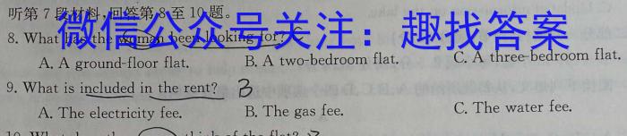 听第7段材料,回答第8至10题。8.What has the woman been looking for?CA. A ground-floor flat.B.A two-bedroom flat.C.A three-bedroom flat.9. What is included in the rent?BA. The electricity fee. B.The gas fee. C.The water fee.