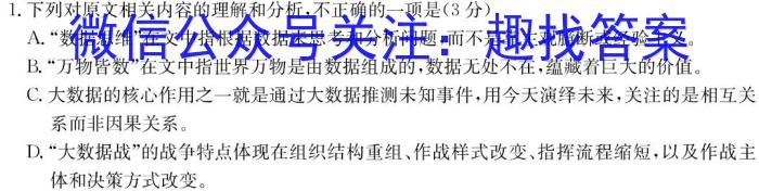 1.下列对原文相关内容的理解和分析,不正确的一项是(3分)A.“数据思维”在文中指根据数据来思考和分析问题,而不是靠主观臆断或经验主义。B.“万物皆数”在文中指世界万物是由数据组成的,数据无处不在,蕴藏着巨大的价值。C.大数据的核心作用之一就是通过大数据推测未知事件,用今天演绎未来,关注的是相互关系而非因果关系。D.“大数据战”的战争特点体现在组织结构重组、作战样式改变、指挥流程缩短,以及作战主体和决策方式改变。