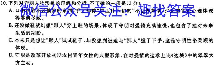 10.下列对守明人物形象的理解和分析,不正确的一项是(3分)A.口中说着不要婆家的东西,手上却像“捍卫什么似的”不让妹妹拿,少女的害羞心理体现得淋漓尽致。B.还没做鞋就幻想“那人”穿上鞋的场景,体现了守明对爱情充满憧憬,也包含了她对未来生活的期盼。C.本来只是想让“那人”试试鞋子,却没想到被迫与“那人”握了下手,这是守明性格柔顺的体现。D.守明是改革开放初期农村青年女性的典型形象,在对爱情的追求上比《边城》中的翠翠大方主动。