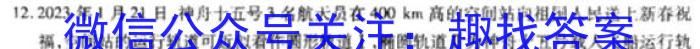 12.2023年1月21日,神舟十五号3名航大员在400km高的空间站向祖国人民送上新春祝福,空间站的运行轨道可近似看作圆形轨道I,椭圆轨道Ⅱ为神舟十五号载人飞船运行轨道,两轨道相切于A点,飞船经过变轨,可与空间站成功对接。设地球表面重力加速度为g,地球半径为下列说法正确的是A.在A点时神舟十五号经过点火加速才能从轨道Ⅱ进人轨道IB.飞船在轨道的运行周期大于空间站在轨道1的运行周期C.空间站在轨道I上的速度小于,gRD.轨道I上的神舟十五号想与前方的空间站对接,只需要沿运动方向加速即可