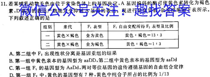 11.若某哺乳动物毛色由位于常染色体上的基因决定,A基因编码的酶可使黄色素转化为褐色素,D基因的表达产物能完全抑制A基因的表达。现进行杂交实验,杂交结果如下表所示。下列叙述正确的是A.第二组中F2出现性状分离是基因重组的结果B.第一组中黄色亲本的基因型为aaDD,第二组中黄色亲本的基因型为aaDdC.第一组F1的基因型为AaDd,两对等位基因的遗传遵循基因的自由组合定律D.第一组F2,中,黄色的基因型有7种,黄色中纯合子所占的比例为1/13