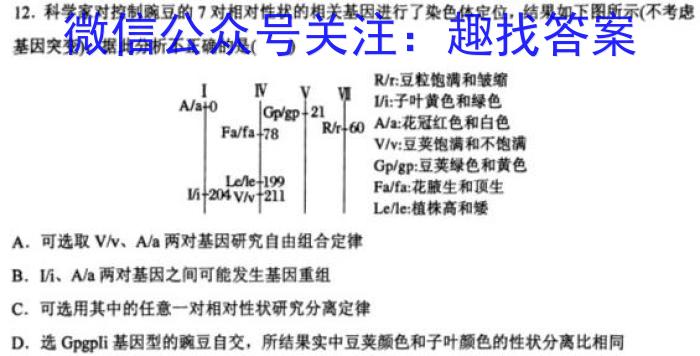 12.科学家对控制豌豆的7对相对性状的相关基因进行了染色体定位,结果如下图所示(不考虑基因突变),据此分析不正确的是()A.可选取V/v、A/a两对基因研究自由组合定律B.、A/a两对基因之间可能发生基因重组C.可选用其中的任意一对相对性状研究分离定律D.选GpgpIi基因型的豌豆自交,所结果实中豆荚颜色和子叶颜色的性状分离比相同