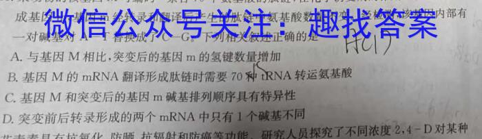 18.某动物的核基因M可编码一条含70个氨基酸的肽链,在化学诱变剂的作用下该基因突变成基因m,,基因m经转录和翻译后产生的肽链中氨基酸数量不变。经检测,该基因内部有一对碱基对A-T替换成了C-G.下列相关叙述正确的是ACl)A.与基因M相比,突变后的基因m的氢键数量增加B.基因M的nRNA翻译形成肽链时需要70种tRNA转转运C.基因M和突变后的基因m碱基排列顺序具有特异性D.突变前后转录形成的两个mRNA中只有1个碱基不同