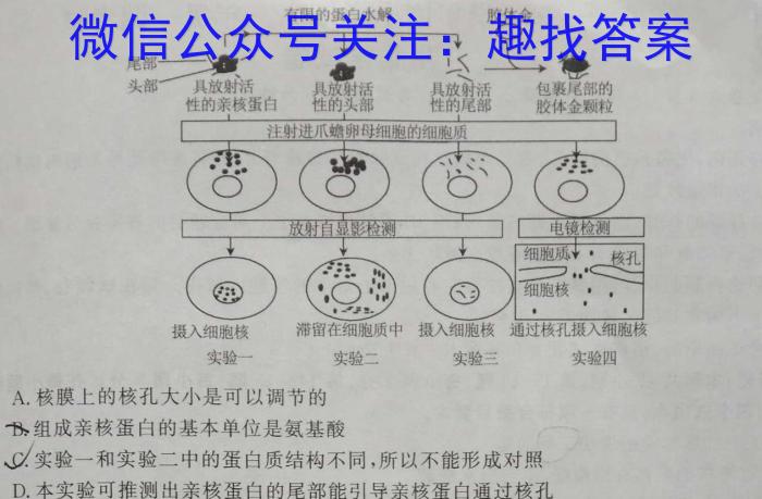 尾部头部A.核膜上的核孔大小是可以调节的B.组成亲核蛋白的基本单位是氨基酸C.实验一和实验二中的蛋白质结构不同,所以不能形成对照D.本实验可推测出亲核蛋白的尾部能引导亲核蛋白通过核孔