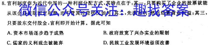 8.官利制度作为近代中国的一种利润分配方式,其特点在于:其一,只要购买了企业的股票就能从该企业获取固定利率,而不管其经营状况如何;其二,先派官利,然后结算营业利益;其三,只要股东交付股金,官利即开始计算。据此可知A.资本市场逐步趋于成熟B.政府放宽了兴办实业的限制C.儒家的义利观念被抛弃D.民族工业发展环境亟须改善