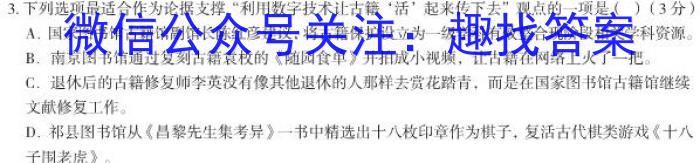 3.下列选项最适合作为论据支撑“利用数字技术让古籍‘活’起来传下去”观点的一项是()(3分)A.国家图书馆古籍馆副馆长陈红彦建议,将古籍保护设立为一级学科有效整合现阶段相关学科资源。B.南京图书馆通过复刻古籍袁枚的《随园食单》并拍成小视频,让古籍在网络上火了一把。C.退休后的古籍修复师李英没有像其他退休的人那样去赏花踏青,而是在国家图书馆古籍馆继续文献修复工作。D.祁县图书馆从《昌黎先生集考异》一书中精选出十八枚印章作为棋子,复活古代棋类游戏《十八子围老虎》。