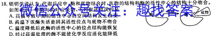18.锁钥学说认为:代谢反应中,酶和底物结合时,底物的结构和酶的活性中心的结构十分吻合。如图表示一种酶与其对应底物,下列叙述错误的是A.高温导致了酶的活性中心的空间结构发生改变B.高温下该酶失活是因其活性位点与底物不吻合C.温度降低后此酶的活性中心的位点结构能恢复D.经过高温处理的酶不能使化学反应活化能降低