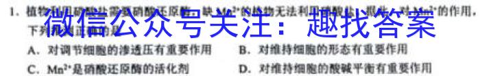 1.植物利用硝酸盐需要硝酸还原酶,缺Mn^2+的植物无法利用硝酸盐,据此,对Mn^2*的作用,下列推测正确的是A.对调节细胞的渗透压有重要作用B.对维持细胞的形态有重要作用C.Mn^2+是硝酸还原酶的活化剂D.对维持细胞的酸碱平衡有重要作用