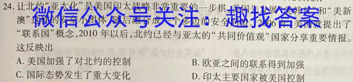 24.让北约“亚太化”是美国印太战略非常重要的一步棋,美国先发展“美韩日”和“美新澳”这样的安全小团体,随后融合成一个多边的安全同盟。2006年美国就提出了“联系国”概念,2010年以后,北约已经与亚太的“共同价值观”国家分享重要情报。这反映出A.美国加强了对北约的控制B.欧亚之间的联系得到加强C.国际态势发生了重大变化D.印太主要国家被美国控制