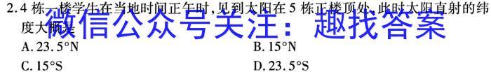 2.4栋一楼学生在当地时间正午时,见到太阳在5栋正楼顶处,此时太阳直射的纬度大概是A.23.5^NB.15^NC.15^SD.23.5^S