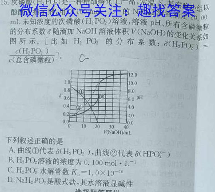 产品(H3PO2)15.次磷酸(HPO)是一种精细磷化工产品,常温下,某实验小组以0.100mol⋅L酚酞为指示剂,用0.100mol·L的NaOH溶液滴定20.00NaOH(H3PO2)mL未知浓度的次磷酸(H:PO:)溶液,溶液pH、所有含磷微粒NaOH的分布系数δ随滴加NaOH溶液体积V(NaOH)的变化关系如V(NaOH)H2PO2图所示。[比如HPO的分布系数:8(HPO)=8(H2PO2^-)=c(H2PO2^-)c((总含磷微粒)-]C下列叙述正确的是A.曲线①代表8(H2PO2^-),②代表,曲线8(HPO2^2-)B.H3PO2溶液的浓度为0.100molL^-1C.H2PO2^-水解常数Kh=1.010^-10D.NaH2PO2是酸式盐,其水溶液显碱性