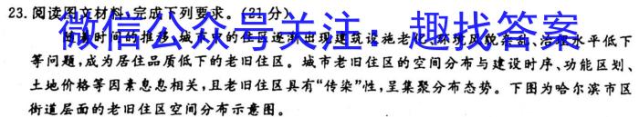 23.阅读图文材料,完成下列要求。(21分)随着时间的推移,城市中的住区逐渐出现建筑设施老化、环境风貌杂乱、治理水平低下等问题,成为居住品质低下的老旧住区。城市老旧住区的空间分布与建设时序、功能区划、土地价格等因素息息相关,且老旧住区具有“传染”性,呈集聚分布态势。下图为哈尔滨市区街道层面的老旧住区空间分布示意图。(1)推测哈尔滨老旧住区的主要住户类型。(3分)(2)判断甲地附近主要的城市功能区类型,并说明该地住区老化严重的原因。(6分)(3)哈尔滨老旧住区多呈现集聚分布态势,对此作出合理解释。(6分)