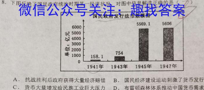 8.下图反映了国民政府统治时期某一经济状况,对图中信息解读正确的是(A.抗战胜利后政府获得大量经济赔偿B.国民经济建设运动刺激了货币发行C.货币大量增发给民族工业巨大压力D.布雷顿森林体系推动中国货币需求