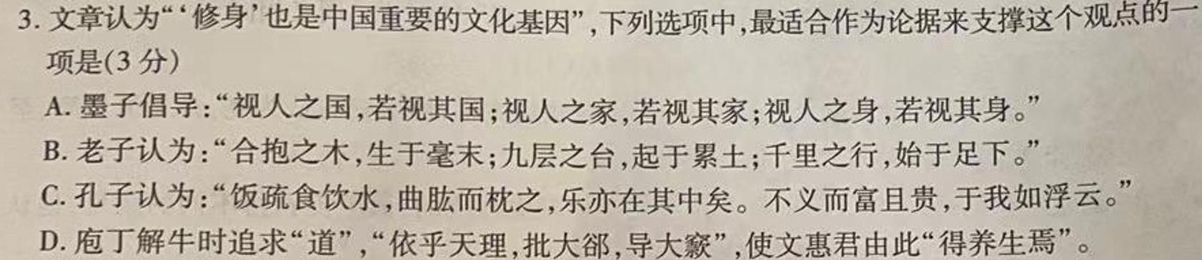 3.文章认为“修身”也是中国重要的文化基因”,下列选项中,最适合作为论据来支撑这个观点的一项是(3分)A.墨子倡导:“视人之国,若视其国;视人之家,若视其家;视人之身,若视其身。”B.老子认为:“合抱之木,生于毫末;九层之台,起于累土;千里之行,始于足下。”C.孔子认为:“饭疏食饮水,曲肱而枕之,乐亦在其中矣。不义而富且贵,于我如浮云。”D.庖丁解牛时追求“道”,“依乎天理,批大郤,导大窾”,使文惠君由此“得养生焉”。