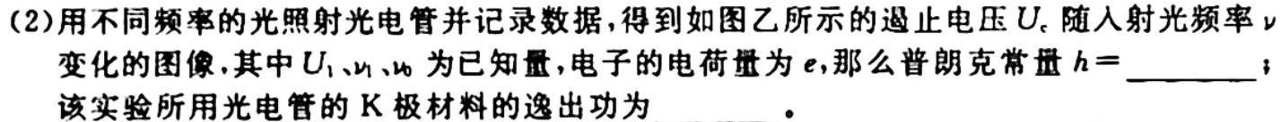 (2)用不同频率的光照射光电管并记录数据,得到如图乙所示的遏止电压Uc随入射光频率ν变化的图像,其中U1、v1、v0为已知量,电子的电荷量为e,那么普朗克常量h=;该实验所用光电管的K极材料的逸出功为。