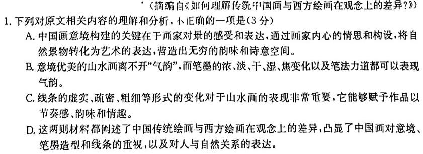 ·(摘编自G如何理解传统中国画与西方绘画在观念上的差异?》)1.下列对原文相关内容的理解和分析,正确的一项是(3分)A.中国画意境构建的关键在于画家对景的感受和表达,通过画家内心的情思和构设,将自然景物转化为艺术的表达,营造出无穷的味和诗意空间。B.意境优美的山水画离不开“气的”,而笔墨的浓、淡、干、湿、焦变化以及笔法力道都可以表现气韵。C.线条的虚实、疏密、粗细等形式的变化对于山水画的表现非常重要,它能够赋予作品以节奏感、韵味和情趣。D.这两则材料都述了中国传统绘画与西方绘画在观念上的差异,凸显了中国画对意境、笔墨造型和线条的重视,以及对人与自然关系的表达。