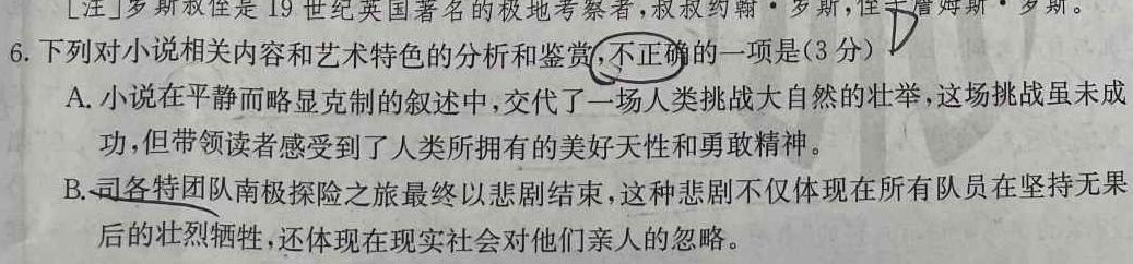 注]罗斯叔侄是19世纪英国著名的极地考察者,叔叔约翰·罗斯,侄子詹姆斯·罗斯。6.下列对小说相关内容和艺术特色的分析和鉴赏,不正确的一项是(3分)DA.小说在平静而略显克制的叙述中,交代了一场人类挑战大自然的壮举,这场挑战虽未成功,但带领读者感受到了人类所拥有的美好天性和勇敢精神。B.司各特团队南极探险之旅最终以悲剧结束,这种悲剧不仅体现在所有队员在坚持无果后的壮烈牺牲,还体现在现实社会对他们亲人的忽略。