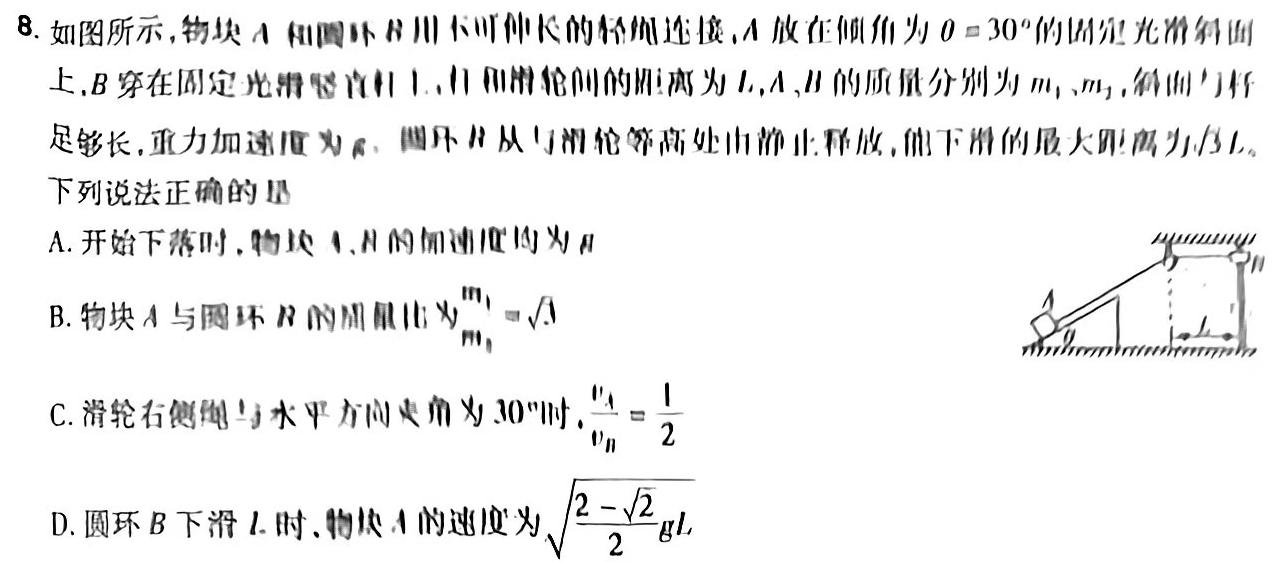 8.如图所示,物块A和环8川不可伸长的杯连接,A放在倾角为0=30^的固定光滑斜出上,B穿在周定光滑驿直1.11m滑轮间的离为1,A,B的质量分别为m1、ml2,,斜面与杆足够长,重力加速度为、四环从与滑轮等高处由静止释放,他下滑的最大离为下列说法正确的是A.开始下落时,物块的加速均为B.物块A与圆环的比\xm1^m1=3C.滑轮右侧绳与水平方向夹角为30^v1vn=12D.圆环B下滑1.时,物块A的速度为