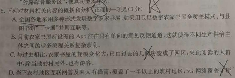 5.下列对材料相关内容的概括和分析正确的的一项是(3分)A.全国各地采用多种形式发展数字农家书屋,如采用卫星数字农家书屋全覆盖模式、与县图书馆”卡通”并网互联等。B.目前农家书屋所设有的App往往只有单向的意见反馈通道,这就使得不同生产供给主体之间的业务流程关系复杂紊乱。C.与过去相比,农家书屋的规模变化大,已由过去的变成了园区,来此阅读的人群中,除当地的村民外,也有游客。D.当下农村地区互联网普及率大有提高,覆盖了一半以上的农村地区,5G网络覆盖盖了所