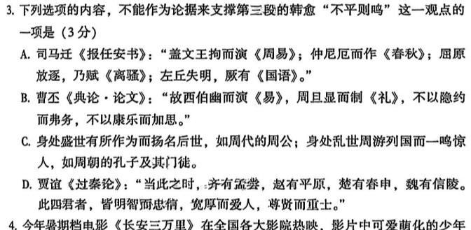 3.下列选项的内容,不能作为论据来支撑第三段的韩愈“不平则鸣”这一观点的一项是(3分)A.司马迁《报任安书》:“盖文王拘而演《周易》;仲尼厄而作《春秋》;屈原放逐,乃赋《离骚》;左丘失明,厥有《国语》。”B.曹丕《典论·论文》:“故西伯幽而演《易》,周旦显而制《礼》,不以隐约而弗务,不以康乐而加思。”C.身处盛世有所作为而扬名后世,如周代的周公;身处乱世周游列国而一鸣惊人,如周朝的孔子及其门徒。D.贾谊《过秦论》:“当此之时,齐有孟尝,赵有平原,楚有春申,魏有信陵。此四君者,皆明智而忠信,宽厚而爱人,尊贤而重士。”