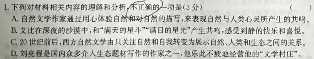 1.下列对材料相关内容的理解和分析,不正确的一项是(3分)()A.自然文学作家通过用心体验自然和对自然的描写,来表现自然与人类心灵所产生的共鸣。B.艾比在深夜的沙漠中,和“满天的星斗”“满目的星光”产生共鸣,感受到静的快乐和喜悦。C.20世纪前后,西方自然文学由只关注自然和自我转变为展示自然、人类和生态之间的关系。D.刘亮程是国内众多介入生态题材写作的作家之一,他乐此不疲地经营他的“文学村庄”。