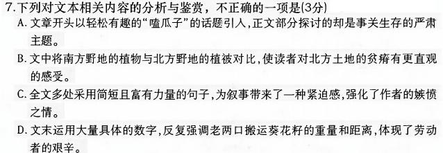 7.下列对文本相关内容的分析与鉴赏,不正确的一项是(3分)A.文章开头以轻松有趣的“嗑瓜子”的话题引人,正文部分探讨的却是事关生存的严肃主题。B.文中将南方野地的植物与北方野地的植被对比,使读者对北方土地的贫瘠有更直观的感受。C.全文多处采用简短且富有力量的句子,为叙事带来了一种紧迫感,强化了作者的嫉愤之情。D.文末运用大量具体的数字,反复强调老两口搬运葵花籽的重量和距离,体现了劳动者的艰辛。