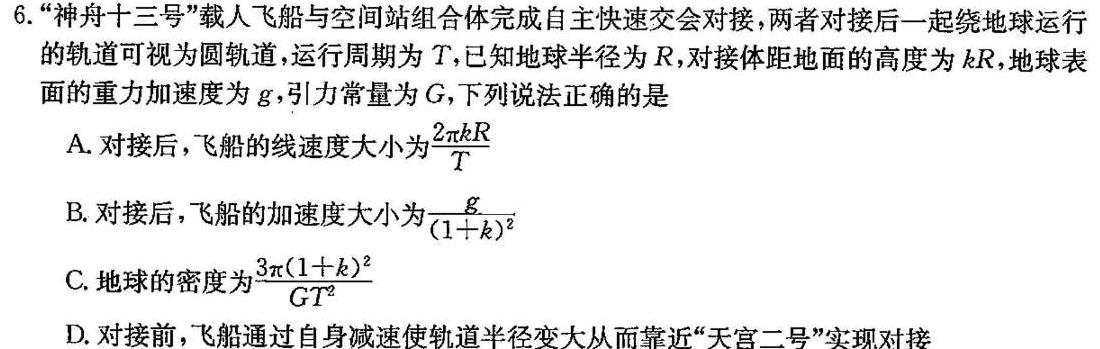 6.“神舟十三号”载人飞船与空间站组合体完成自主快速交会对接,两者对接后一起绕地球运行的轨道可视为圆轨道,运行周期为T,已知地球半径为R,对接体距地面的高度为k地球表面的重力加速度为g,,引力常量为G,下列说法正确的是A.对接后,飞船的线速度大小为2kRTB.对接后,飞船的加速度大小为8(1+k)^2C.地球的密度为3(1+k)^2GT^2D.对接前,飞船通过自身减速使轨道半径变大从而靠近“天宫二号”实现对接