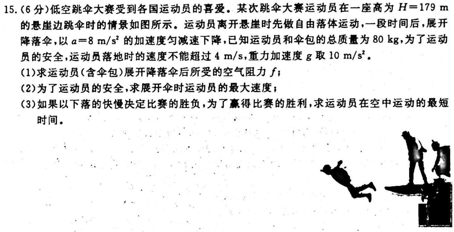15.(6分)低空跳伞大赛受到各国运动员的喜爱。某次跳伞大赛运动员在一座高为H=179m的悬崖边跳伞时的情景如图所示。运动员离开悬崖时先做自由落体运动,一段时间后,展开降落伞,以a=8m/s^2的加速度匀减速下降,已知运动员和伞包的总质量为80kg,为了运动员的安全,运动员落地时的速度不能超过4m/s,重力加速度g取10m/s^2。(1)求运动员(含伞包)展开降落伞后所受的空气阻力f;(2)为了运动员的安全,求展开伞时运动员的最大速度;(3)如果以下落的快慢决定比赛的胜负,为了赢得比赛的胜利,求运动员在空中运动的最短时间。