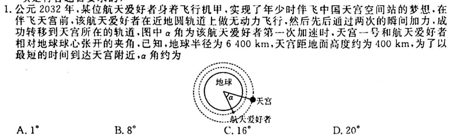 1.公元2032年,某位航天爱好者身着飞行机甲,实现了年少时伴飞中国天宫空间站的梦想,在伴伴飞天宫前,该航天爱好者在近地圆轨道上做无动力飞行,然后先后通过两次的瞬间加力,成功转移到天宫所在的轨道,图中a角为该航天爱好者第一次加速时,天宫一号和航天爱好者相对地球球心张开的夹角,已知,地球半径为6400km,天宫距地面高度约为400km,为了以最短的时间到达天宫附近,a角约为A.1^B.8^D.20^