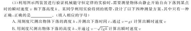 (3)利用图示丙装置进行验证机械能守恒定律的实验时,需要测量物体由静止开始自由下落到某点时的瞬时速度v和下落高度h。某同学利用实验得到的纸带,设计了以下四种测量方案,其中只有一种正确,正确的是。(填人相应的字母)h,并测出下落时间t,通过v=gtA.用刻度尺测出物体下落的高度计算出瞬时速度vB.用刻度尺测出物体下落的高度h,,并通过v=2gh计算出瞬时速度v