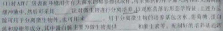 (1)对房表面环境用含有无菌水的棉签擦拭取样,将采集到的样本加人到1m无菌硫酸缓冲液中,然后可采用法对磁生物进行分离培养,以观察菌落的形态学特征;上述方法除可用于分离微生物外,也可用米用于分离微生物的培养基包含水、葡萄,蛋白陈和脂等成分,其中蛋白主要为微生物提供和维生素等。配制好的培养基通(2)抗生素耐药性试验:采用纸片扩散法对分离得到的菌株进行药敏试验,每个平板上放置5个药玻纸片,片的药物扩散范围内菌株的生长会被抑润,形成透明的独菌圈,可以通过测量来反映细菌对测定抗生素的耐药程度,耐药程度越强的菌株观察到的现象是(3)抗紫外线试验:将每株细菌分别接种到2个平板中,其中一个平板在超净工作台环后境下照射10min,照射时需要将培养的盖子(选填打开”或闭合”);照射完毕后,将部平板置于32^