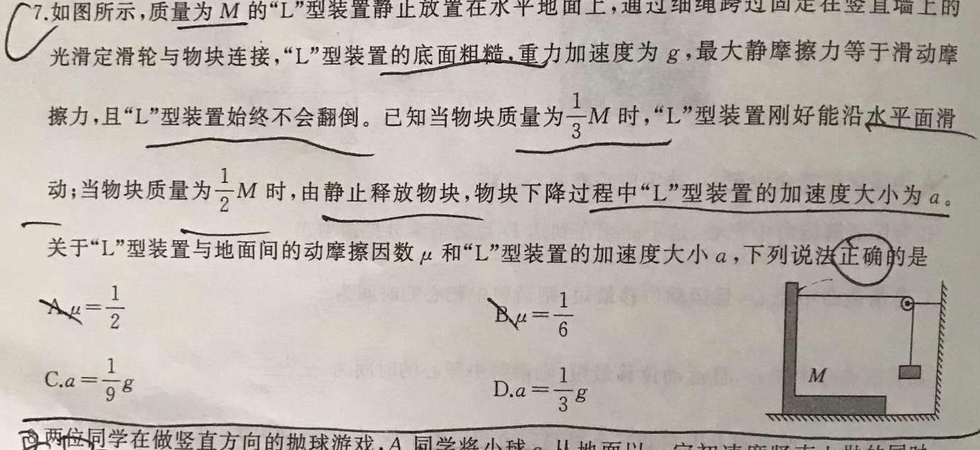 7如图所示,质量为M的“L”型装置静止放置在水平地面上,通过细绳跨过固定在竖直墙上的.如图光滑定滑轮与物块连接,“L”型装置的底面粗糙,重力加速度为g,最大静摩擦力等于滑动摩擦力,且”型装置始终不会翻倒。已知当物块质量为13M时,“L”型装置刚好能沿水平面滑动;当物块质量为12M时,由静止释放物块,物块下降过程中“L”型装置的加速度大小为a。关于“L”型装置与地面间的动摩擦因数和“L”型装置的加速度大小a,下列说法正确的是=12B.u=16C.a=19gD.a=13gM